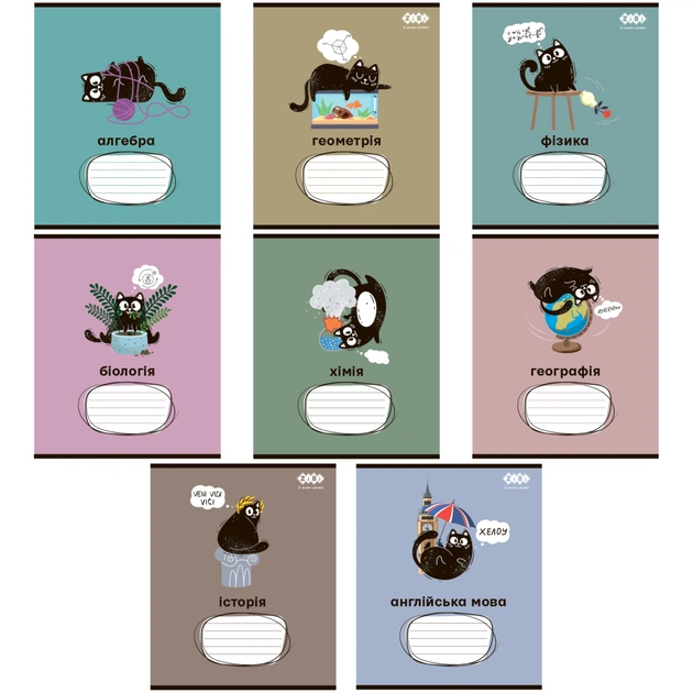 Набір зошитів учнівських загальних серії "CRAZY CAT", мікс 10 штук. 8 предметів: алгебра - 2 шт, геометрія - 2 шт, фізика - 1 шт, хімія - 1 шт, біологія - 1 шт, географія - 1 шт, історія - 1 шт, англійська мова - 1 шт. Лініювання - клітинка. Розмір виробу 203х167 мм. Тип скріплення - скоба. Внутрішній блок - 48 аркушів, офсетний папір щільністю 55 г/м2, білизна 98-100%, поля червоні.