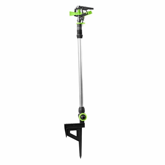 Розпилювач імпульсний пластиковий на штанзі довжиною 75 см використовується для стаціонарного поливу присадибних ділянок при підключенні до водопровідного шлангу за допомогою з’єднувача. Поворот голівки регулюється, що дозволяє поливати визначений сектор. Максимальна площа поливу – 315 м² з дальністю поливу до 24 м. Має 4 режими регулювання або зони поливу: 1/4 кола, 1/2 кола, 3/4 кола, повне коло. Два сполучних гнізда дозволяють використовувати його в ланцюжку поливу з декількох розпилювачів.