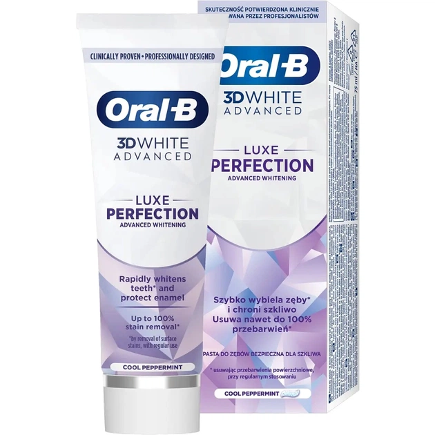Зубна паста Oral-B 3D White Advanced Luxe Perfection - ідеальний вибір для тих, хто прагне бездоганної усмішки та здоров'я зубів. Завдяки інноваційній технології відбілювання, ця зубна паста ефективно усуває поверхневі плями, досягаючи результатів вже з першого застосування та невідкладно усуває до 100% потемніння лише за 5 днів. Її унікальний склад, що включає Glycerin, Sodium Hexametaphosphate та інші, не лише забезпечує білосніжність, але й захищає емаль. Сергій та ніжний аромат перцевої м'яти дарує приємне відчуття свіжості після кожного чищення. Створено для профілактики карієсу та відбілювання, цей продукт підходить для мас-маркету і заслуговує на довіру вашої родини.
