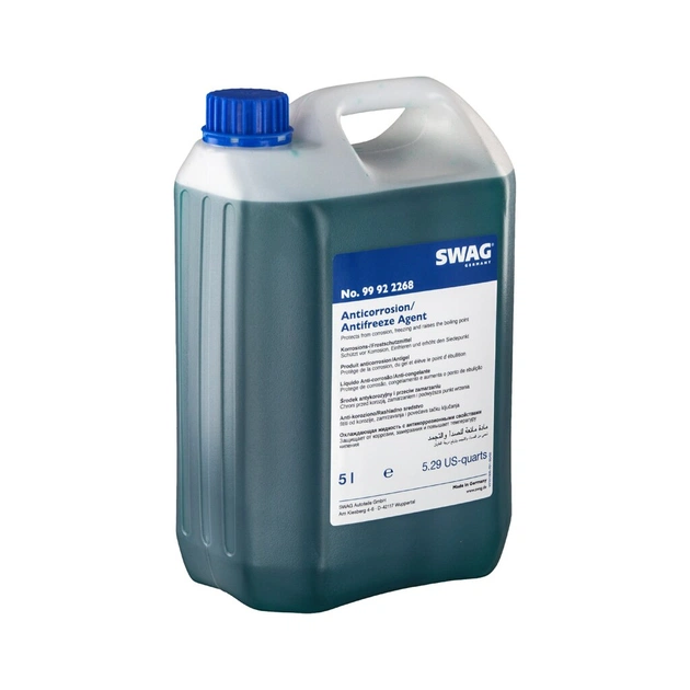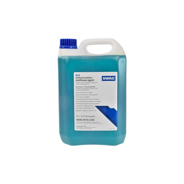 Swag 99922268 5л - Концентрований антифриз синього кольору для систем охолодження легкового і легкого комерційного транспорту виробництва Європи, Америки чи Азії з системами охолодження і двигуна виконаними з лекгосплавні металів або заліза і чавуну. Може застосовуватися для автомобілів вітчизняного виробництва як минулих років випуску, так і сучасних. Виробляється SWAG G11 синій концентрат 99 92 2268 5л на висококласній етиленгліколевій основі, доповненій пакетом присадок, які гарантують максимально ефективну і стабільну роботу системи охолодження на протязі всього терміну експлуатації - 200000 км або 5 років.
