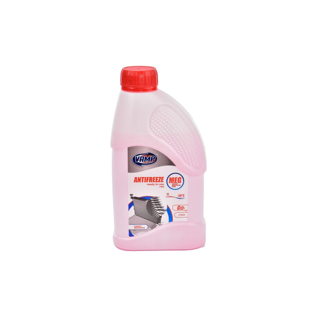 Антифриз ВАМП -40 G12+ червоний 1л/1,08кг (5778) - Охолоджуюча рідина червоного кольору. Вироблена на основі моно-етиленгліколю вищого гатунку за сучасними технологіями, завдяки чому відноситься до антифризу нового покоління G12+ і рекомендується для будь-яких вітчизняних та імпортних транспортних засобів після 2001 року випуску, з двигунами і радіаторами з кольорових металів - алюмінію і міді. Рідина ВАМП G12+ MEG червоний -38C 5778 1л володіє відмінними антиокислювальними властивостями і ефективно захищає також і класичні системи з заліза, що допускає її використання в старіших автомобілях.