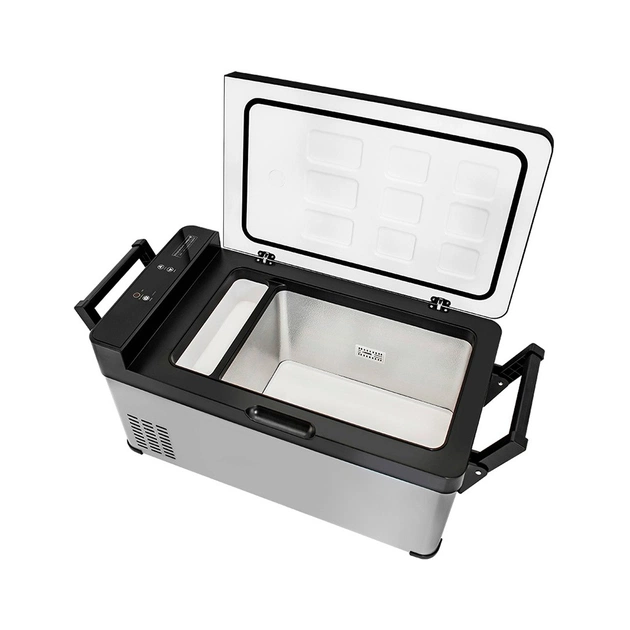 Компресорний автомобільний холодильник на 30 літрів з живленням від мережі 12В/24В або 220В за допомогою адаптера. Для керування передбачені індикатори та сенсорна панель.