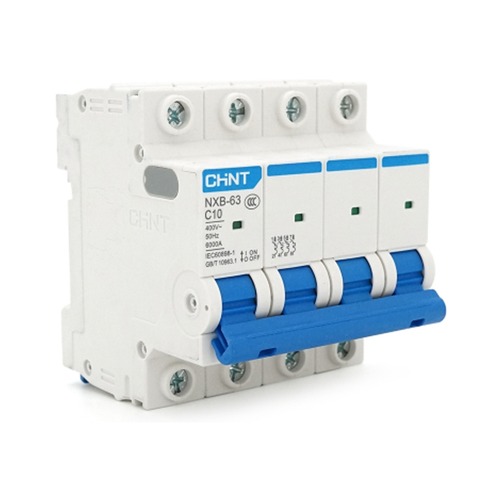 Автоматичний вимикач CHINT NXB-63 4P C10 - це модульний пристрій захисту електричних ланцюгів змінного струму в промислових та побутових мережах. Чотирьохполюсний автомат номінальним струмом 10А з характеристикою спрацьовування «C» призначений для комплексного захисту трьох фазних провідників та нульового дроту. Відповідність міжнародним стандартам безпеки гарантує надійну роботу у мережах до 400В.