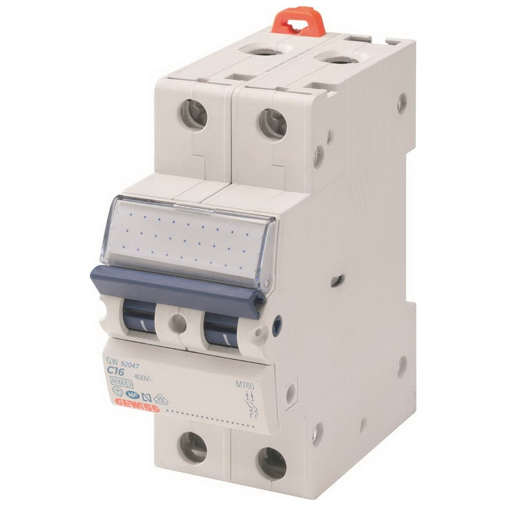 Gewiss GW92047 – двополюсний автоматичний вимикач з характеристикою спрацьовування "C" і здатністю відключення 6 кА, ідеально підходить для захисту від коротких замикань і перевантажень.