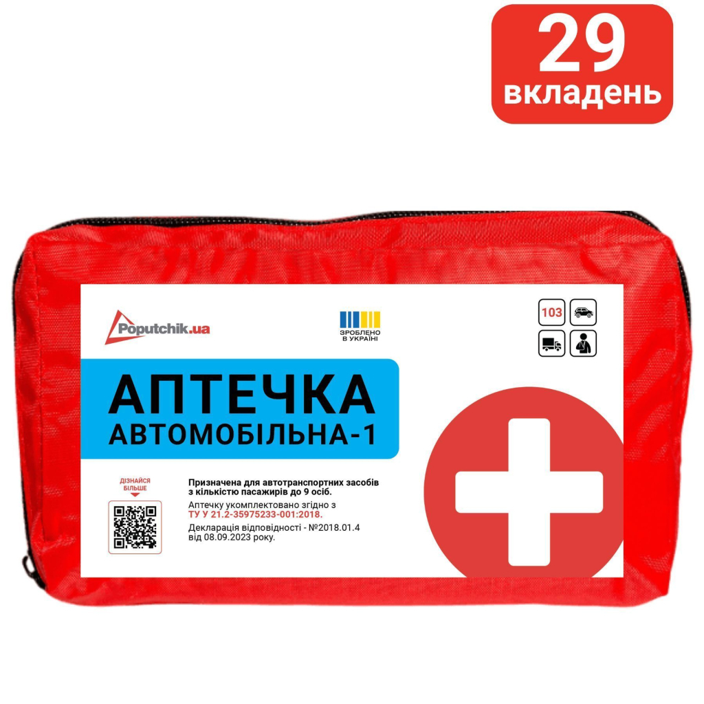 Аптечка Автомобільна-1 до 9 осіб (02-021-М) згідно ТУ У 21.2-35975233-001:2018 призначена для укомплектування легкових, вантажних автомобілів, а також колісних тракторів Це набір виробів медичного призначення, оснащений антисептичними, дезінфікуючими, реанімаційними, фіксуючими та іншими допоміжними засобами для своєчасного надання першої медичної допомоги постраждалому при травмах, переломах, вивихах, втраті свідомості. Для правильного використання складових аптечка комплектується довідником по наданню першої допомоги та рекомендації по застосуванню вкладень.