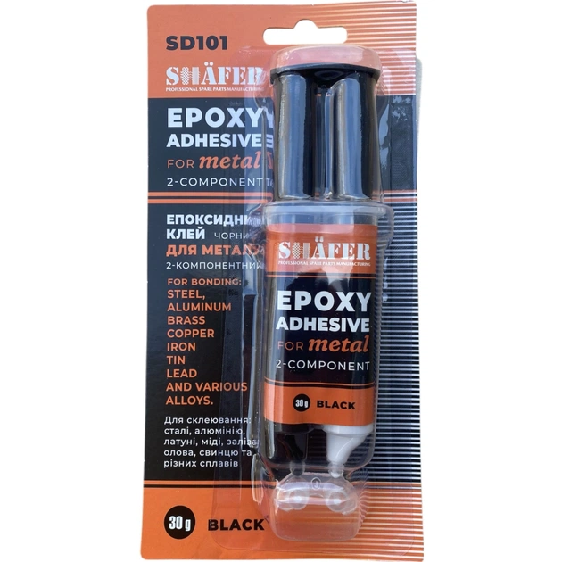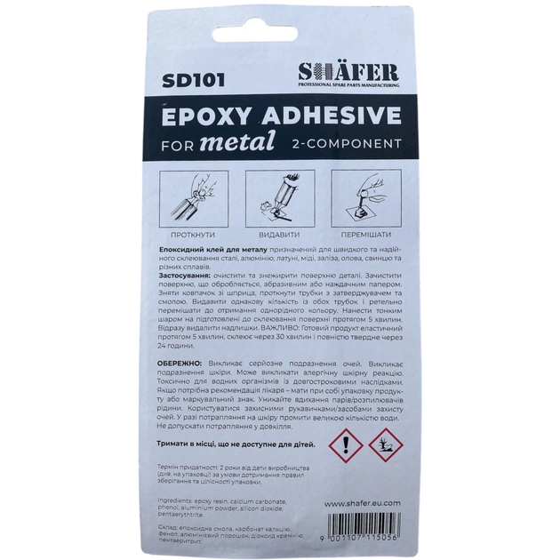 Shafer SD101 призначена для швидкого та надійного склеювання сталі, алюмінію, латуні, міді, заліза, олова, олива та різних сплавів. Твердне упродовж 4 хвилин. Повне затвердіння настає через 2-3 години, з'єднання набуває високої механічної міцності на зсув (3-5 N/mm2) і витримує температуру до 150 °C. Застосовується для заповнення тріщин і порожнин, просвердлених отворів, для відновлення пошкодженої різі, а також як шпаклівка для ремонту плоских поверхонь. Цей продукт склеює також кераміку, бетон, дерево та їхнє з'єднання.
