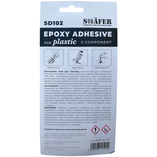 Shafer SD102 — двокомпонентний клей для пластмас. Полімерна смола на епоксидній основі Shafer SD102 призначена для швидкого та надміцного склеювання всіх типів пластикових деталей: бамперів, фар, спойлерів, радіаторних решіток тощо.