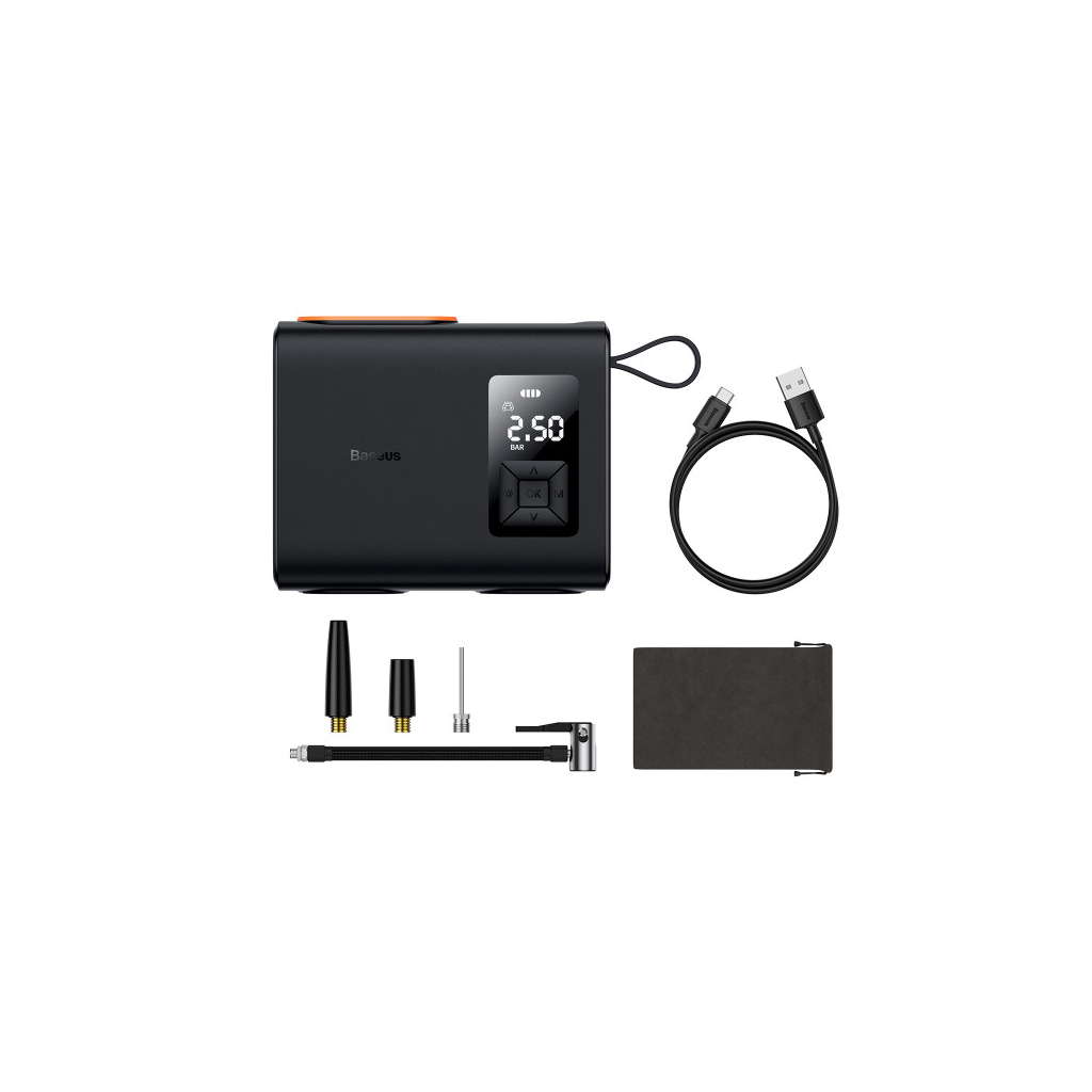 Автомобільний компресор Baseus Mega EnergyPump Series Dual Cylinder оснащено датчиком, що автоматично визначає тиск у шинах під час під'єднання та відображає його на дисплеї, який легко читається.