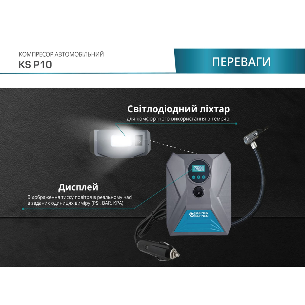 - Зі значною швидкістю 25 літрів повітря на хвилину, KS P10 забезпечує швидке накачування шин і надувних об'єктів всього за кілька хвилин, що особливо цінно в сучасному ритмі життя.