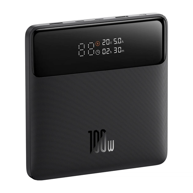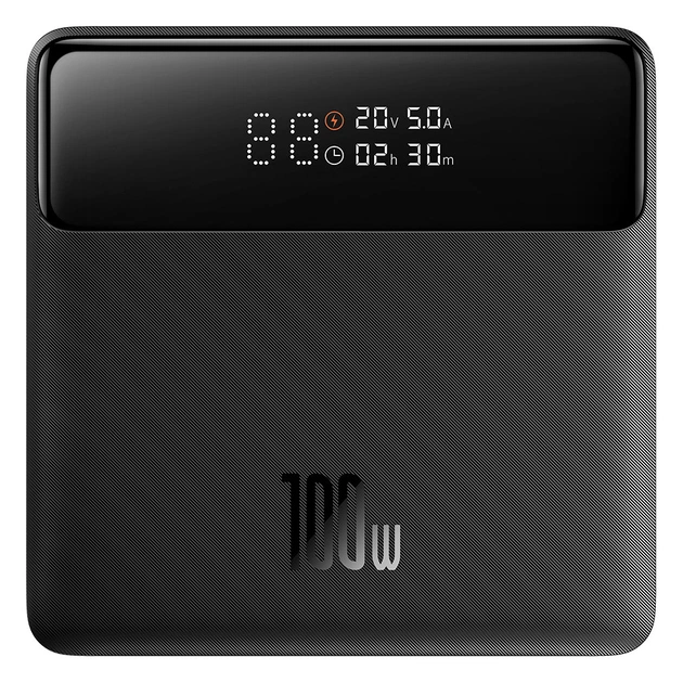 Порти для будь-яких девайсівПовербанк Baseus Blade оснащений чотирма вихідними портами (2хUSB Type-C PD та 2хUSB-А QC) та Type-C кабелем. Порти Type-C підтримують потужність до 100 Вт і підходять для заряджання навіть ноутбуків. Заряджання через порти USB-А відбувається з потужністю до 30 Вт. Сам повербанк заряджається через порт Type-C із потужністю до 65 Вт приблизно за 3 години.