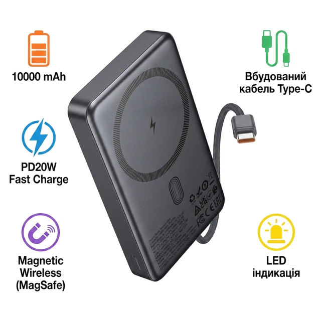 Вбудований кабель Type-C дозволяє заряджати пристрої без необхідності носити додаткові дроти. LED-індикатори на корпусі показують рівень заряду акумулятора та поточний режим роботи.