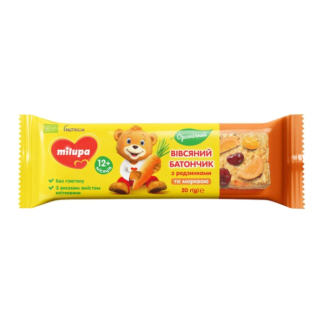 Батончик дитячий Milupa органічний вівсяний з родзинками та морквою від 12 міс. 20 г (4820226169239)
