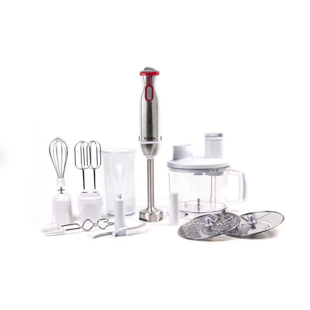 EISEN EBSS-012W - це універсальний блендерний набір «5 в 1»: комбайн, блендер, подрібнювач, міксер, шатківниця. Завдяки різноманітності насадок, здатний виконувати широкий спектр кулінарних завдань: змішувати, шаткувати, збивати, робити пюре, подрібнювати продукти до потрібної консистенції або однорідної маси.