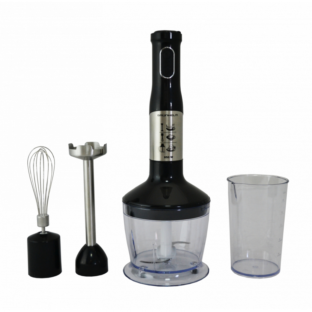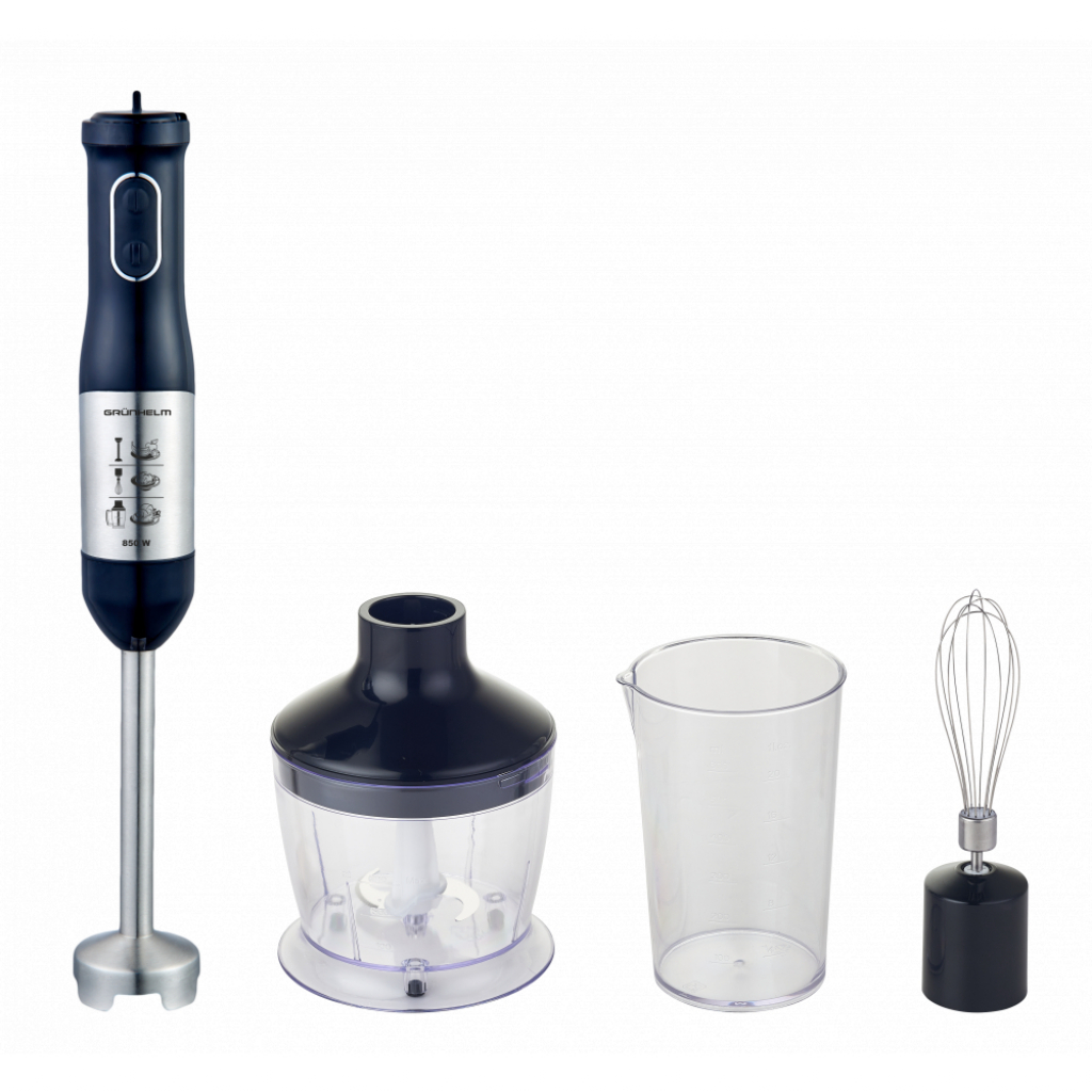 Блендер Grunhelm EBS-857VSC - занурювальна модель для використання в професійних і аматорських цілях. Він володіє ергономічним корпусом, який легко тримати в руці і здійснювати ним обертальні рухи. Простий і зрозумілий інтерфейс складається всього з двох кнопок, а також пояснювальних піктограм, які дають розуміння про основні функції.