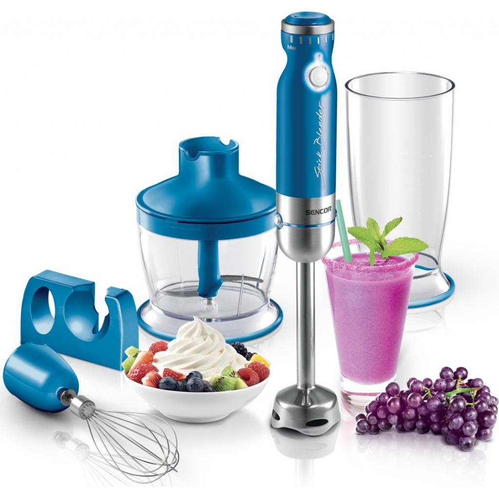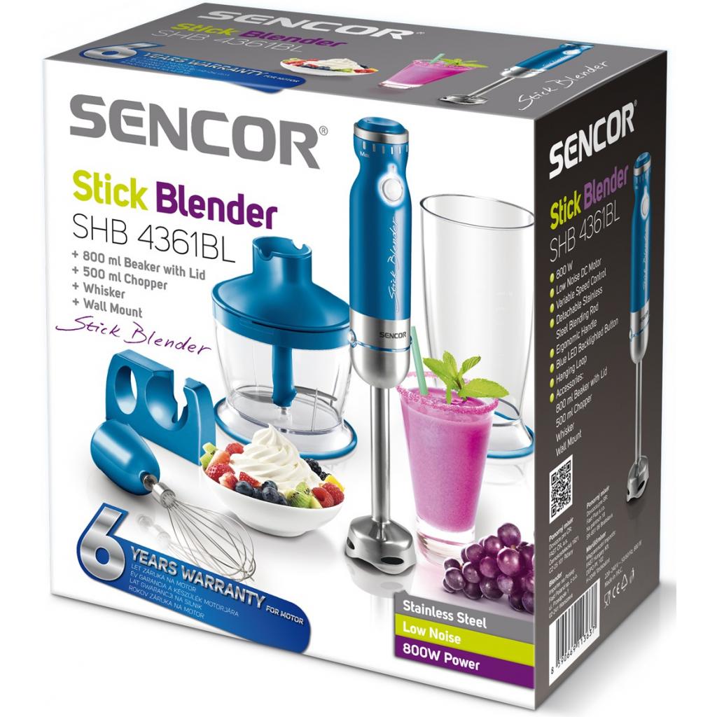Блендер Sencor SHB4361BL являє собою  занурювальний блендер зі знімною ніжкою і гострим ножем з нержавіючої сталі, що дає можливість обробляти навіть гарячі продукти. Блендер даної моделі комплектується пластиковою чашею об'ємом 800 мл для змішування та зберігання продуктів, міні-чоппером ємністю 500 мл для подрібнення продуктів, металевим вінчиком для збивання крему, яєчних білків і вершків. Кнопка вкл/викл світитися приємним м'яким світлом. Блендер для зручності зберігання має петельку для підвішування і спеціальний настінний кронштейн. Чудово підходить для щоденного користування, так як безпечний і простий в експлуатації.