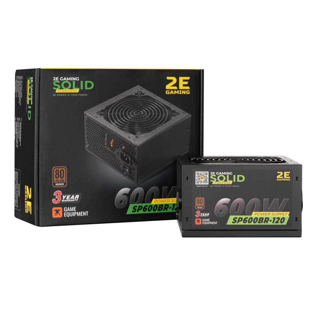 Блок живлення 2E GAMING SOLID POWER (600W), >85, 80+ Bronze, 120mm, 1xMB 24pin(20+4), 1xCPU 8pin(4+4), 3xMolex, (2E-SP600BR-120)