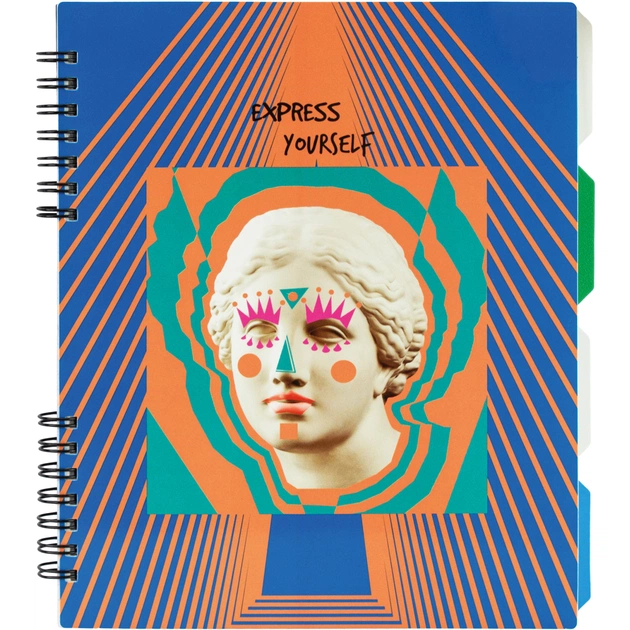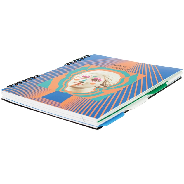 Блокнот формату B5 (170x205). Кріплення блока — спіраль. Обкладинка — пластик. Внутрішній блок — клітинка, цупкість паперу — 65 г/м², кількість аркушів — 120. З роздільниками блока. Вироблено в Україні.