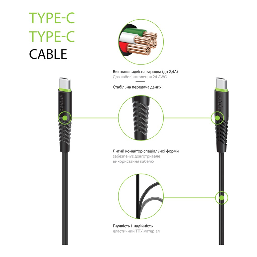 Кабель синхронізації Intaleo CBFLEXTT0 Type-C to Type-C 60W 0.2 м (чорний). Має чудову передачу даних, литий конектор, який забезпечує надійну фіксацію всього дроту, в місцях, які особливо схильні до залому.