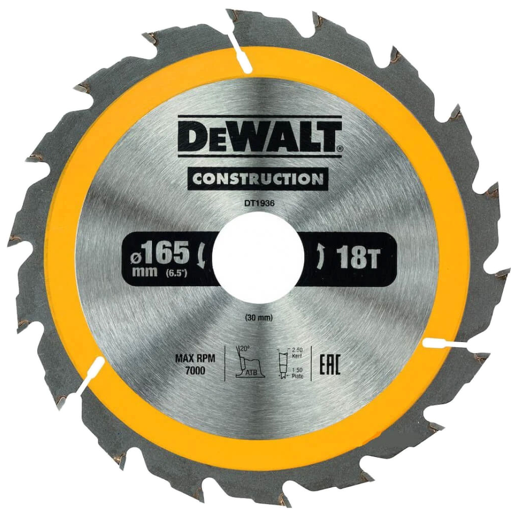 Диск пильний DeWALT CONSTRUCTION, 165х30мм, 18 z, ATB, 20 градусів, 7000 об/хв. (DT1936)