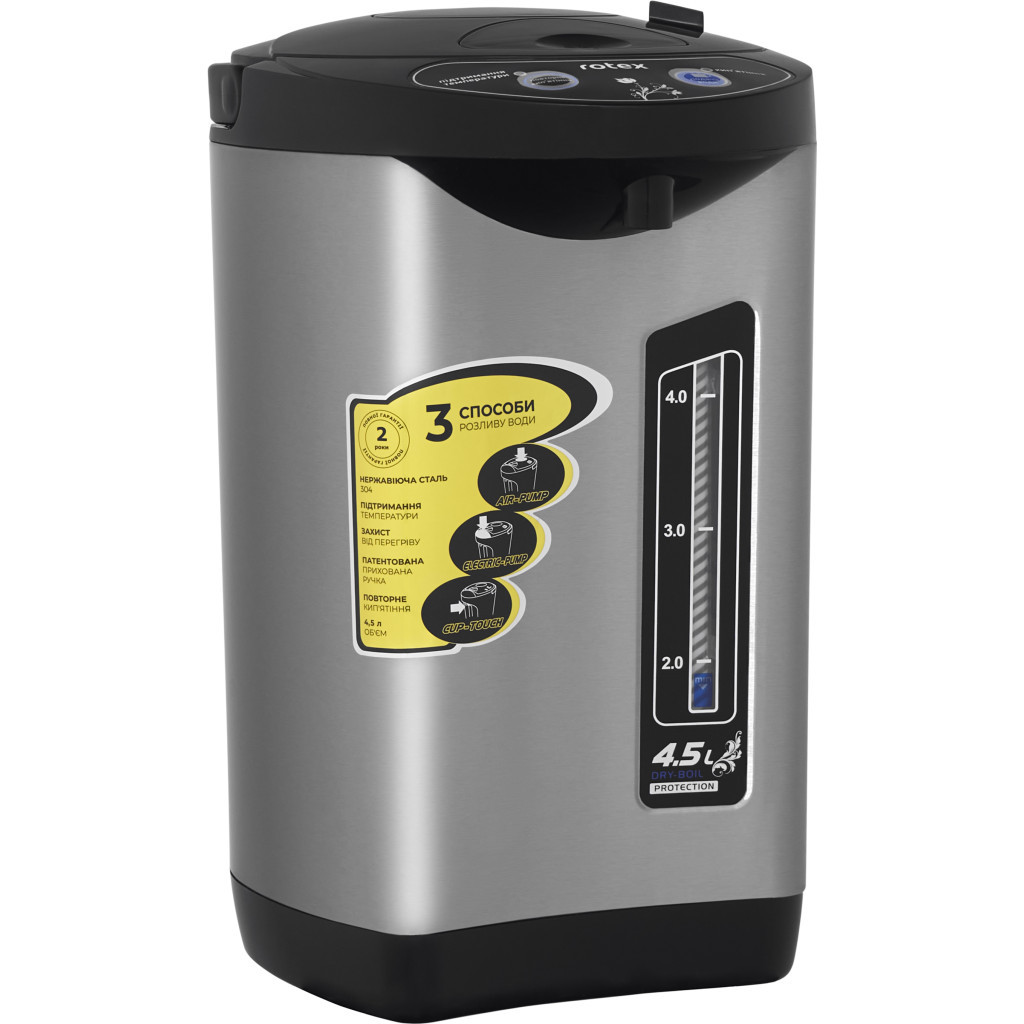 З таким багатим набором функцій і особливостей Rotex RTP452-S стає незамінним помічником у повсякденних ритуалах приготування чаю або кави, забезпечуючи вас необхідною кількістю гарячої води на протязі всього дня. Обираючи цей термопот, ви обираєте надійність, бездоганну функціональність і сучасний стиль, що роблять його одним з кращих на ринку.