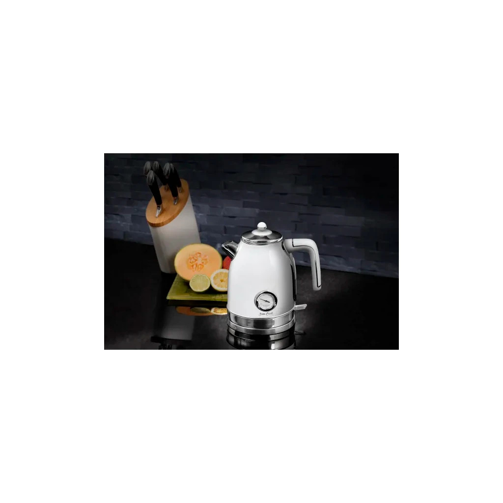 Це аналоговий вимірювач температури, що дозволяє визначати нагрів води навіть при відключенні пристрою від електромережі. Корпус має зручну рукоятку. Кришка повністю знімається. Вилив оснащений багатоступеневим очищенням води від накипу. У цьому чайнику передбачені складальні компоненти електроніки фірми Strix. Такі комплектуючі розраховані тривалий час експлуатації за умови частого включення на регулярній основі. Вилив оснащений довгастим носиком, що помітно підвищує зручність наливання окропу в кружки та чашки. Колба крутиться на платформі на 360 °. Всередину можна залити до 1,7 л води. Електрочайник декорований в унікальному ретростилі.