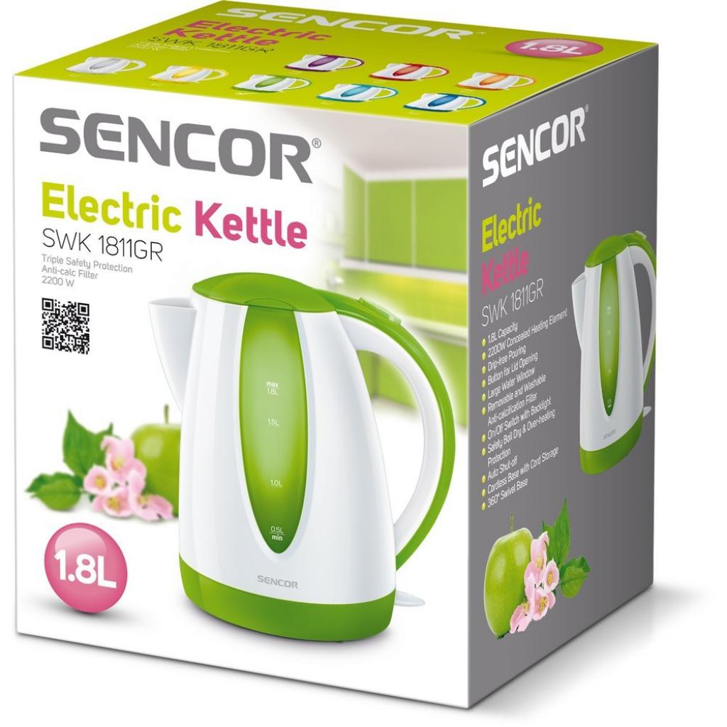 Електрочайник Sencor SWK1811GR являє собою стильний чайник, який відрізняється високою безпекою і зручністю користування. Нагрівальним елементом цього приладу є диск, що забезпечує максимально швидкий нагрів і швидке кип'ятіння води. Чайник має об'єм 1,8, а його потужність складає 2000 Вт. Він володіє стильним дизайном і виконаний в білому (з кольоровою вставкою) кольорі. Прилад відмінно поєднується з кухонним інтер'єром і чудово його доповнює. А з особливостей чайника потрібно виділити фільтр від накипу, індикатор рівня води, блокування кришки, світлова індикація роботи, обертання на 360°, відсік для зберігання шнура.