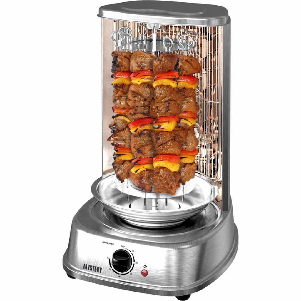 Електрошашличниця Mystery MOT-3320 - c допомогою цієї електричної духової печі-шашличниці ви зможете приготувати стейки з риби або м'яса і соковитий, ароматний шашлик, а також запекти цілу курку, закріпивши її спеціальними зажимами. Завдяки автоматичному поворотному столу-піддону, жар від нагрівача, потужністю 2000 Вт, рівномірно розподіляється у внутрішній камері печі, об'ємом 21 л., пропікаючи блюдо з усіх боків.