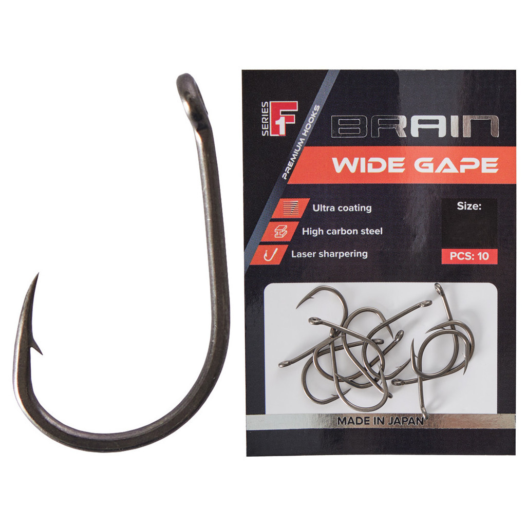 Гачок Brain Wide Gap c прямою цівкою і загнутим всередину жалом, за формою нагадує гачок Brain Snagger, але виконаний з набагато більш тонкої японської високовуглецевого сталевого дроту «СS-80». Для порівняння: товщина дроту гачка Brain Wide Gape №4 становить 0,36 мм, а аналогічного розміру Snagger виготовлений з дроту 0,47 мм. Завдяки своїй товщині гачок Brain Wide Gape є універсальним і відмінно працює на різних монтажах, а також з найрізноманітнішими приманками, в тому числі і плаваючими.
