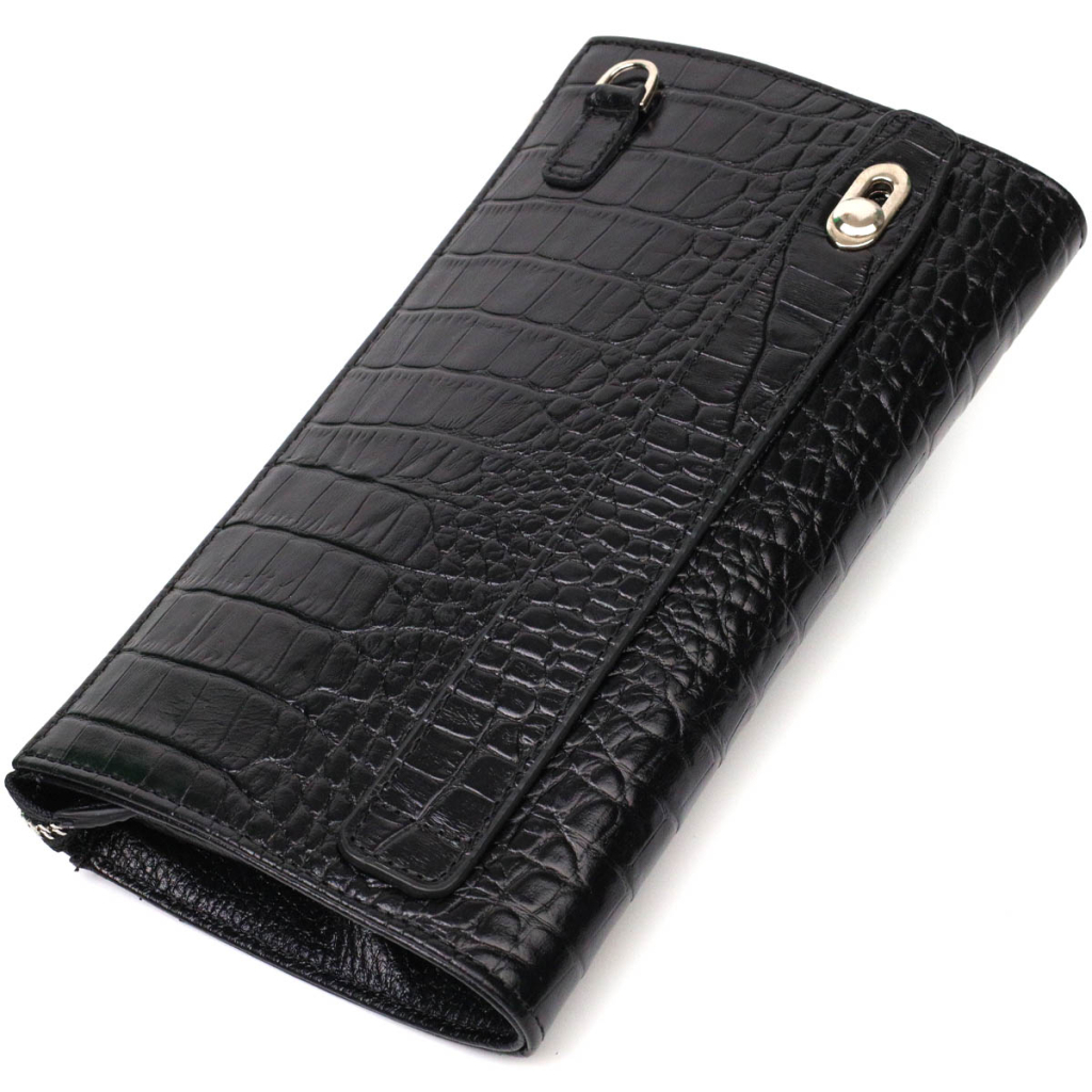 Унікальний чоловічий клатч із натуральної якісної шкіри з тисненням під крокодила, закривається на блискавку. Всередині можна без проблем розміщувати паперові банкноти, банківські картки та навіть смартфон. Аксесуар складається з двох відділень для купюр, двох прилеглих кишень, дванадцяти слотів для кредиток та монетниці на блискавці. Є також ручка для долоні на тильній стороні клатчу та знімний кистьовий ремінь.