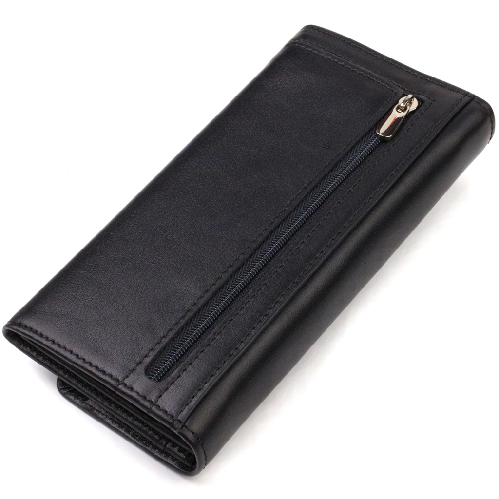 Стильний жіночий гаманець із натуральної зернистої шкіри. Аксесуар має три основні відділення, в які поміщаються купюри всіх номіналів, дві перегородки на блискавках, чотири кишені для карток, дві прилеглі кишені, глибоку кишеню на всю довжину та монетницю. Закривається аксесуар клапаном на кнопку. Відмінний аксесуар від надійного виробника, який прослужить дуже довго.