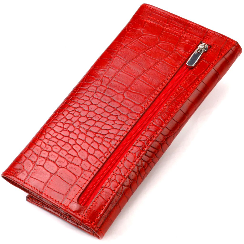 Чудовий фактурний жіночий гаманець горизонтального типу з натуральної шкіри із тисненням під крокодила. Аксесуар має одне основне відділення, шість кишень для карток (одна під сіточкою), одну приховану кишеню, три прилеглі кишені та монетницю. Закривається аксесуар клапаном на кнопку. Купуючи шкіряний аксесуар цієї фірми, собі чи на подарунок, будьте певні, що він прослужить Вам не один рік.