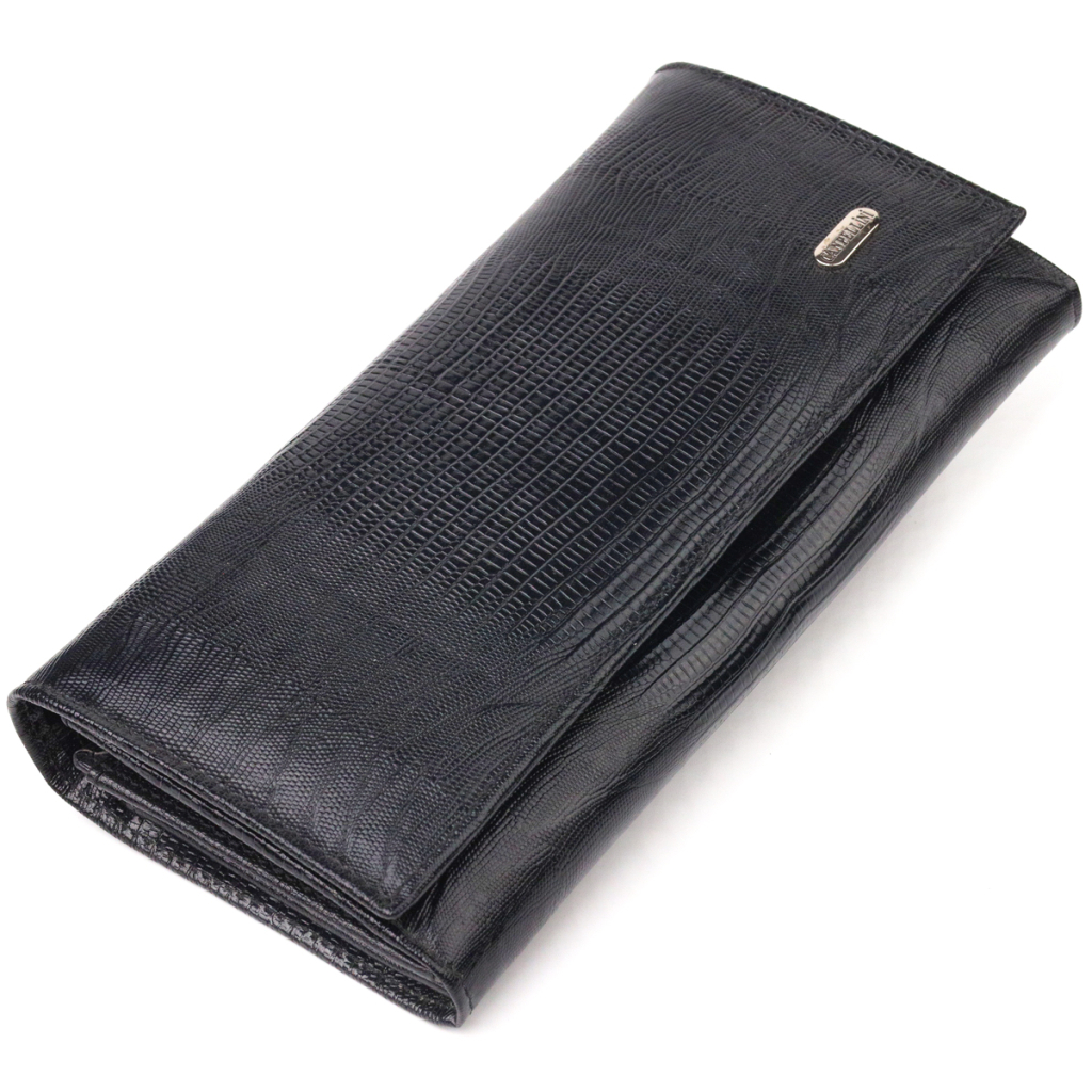 Місткий горизонтальний жіночий гаманець з фактурної натуральної шкіри з тисненням під рептилію. Аксесуар має три великі кишені для купюр, три прилеглі кишені, вісім осередків для карток, три з них під сіточкою, монетницю на блискавці. Виріб закривається клапаном на кнопку.