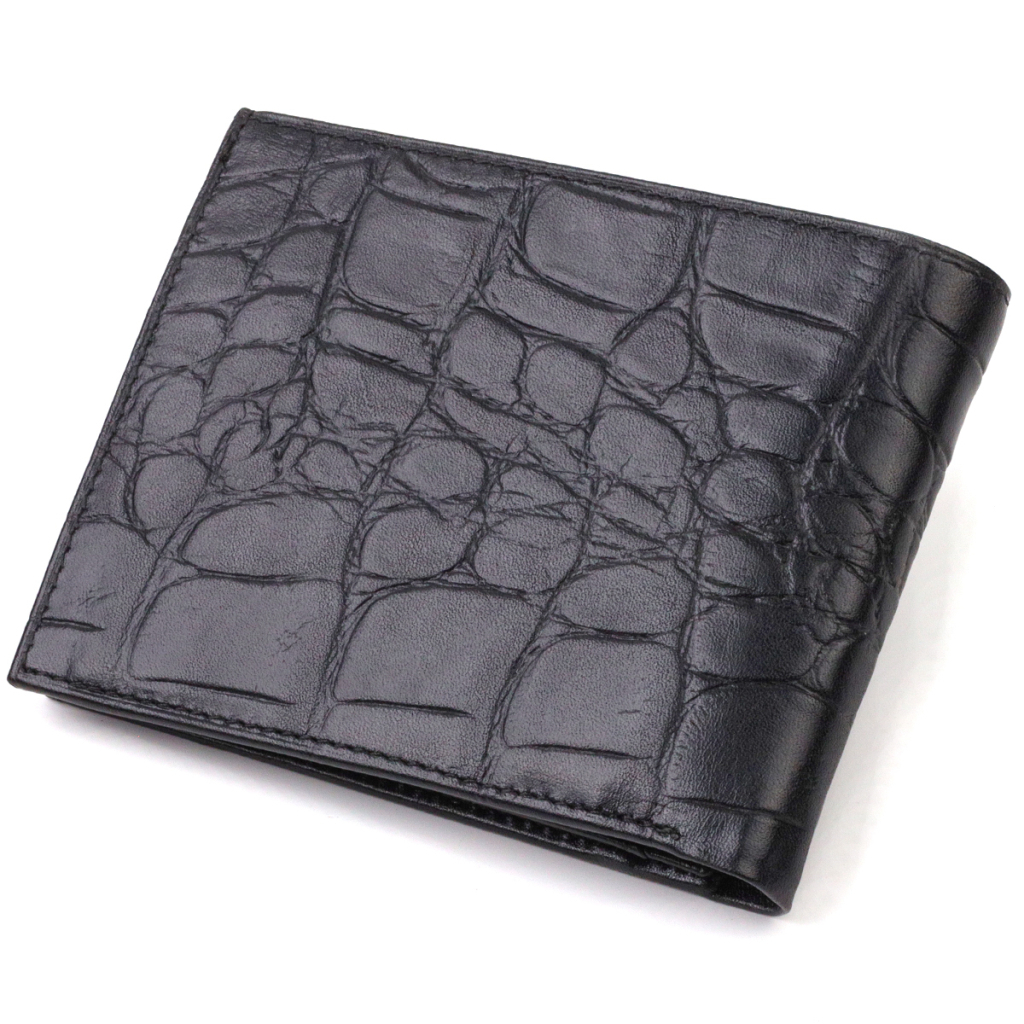 Практичний чоловічий гаманець у чорному кольорі з натуральної шкіри з тисненням під крокодила. Аксесуар має одне основне відділення з перегородкою, в яке поміщаються купюри всіх номіналів, чотири кишені для карток, дві кишені під сіточкою для документів, монетницю та три прилеглі кишені.