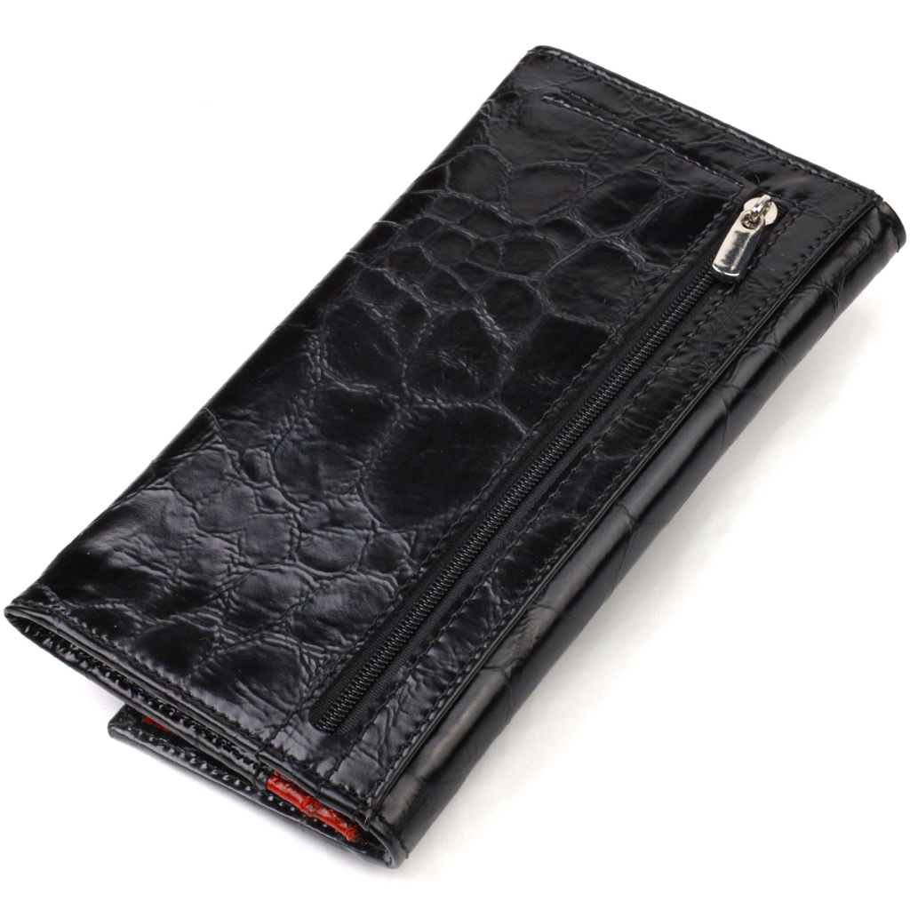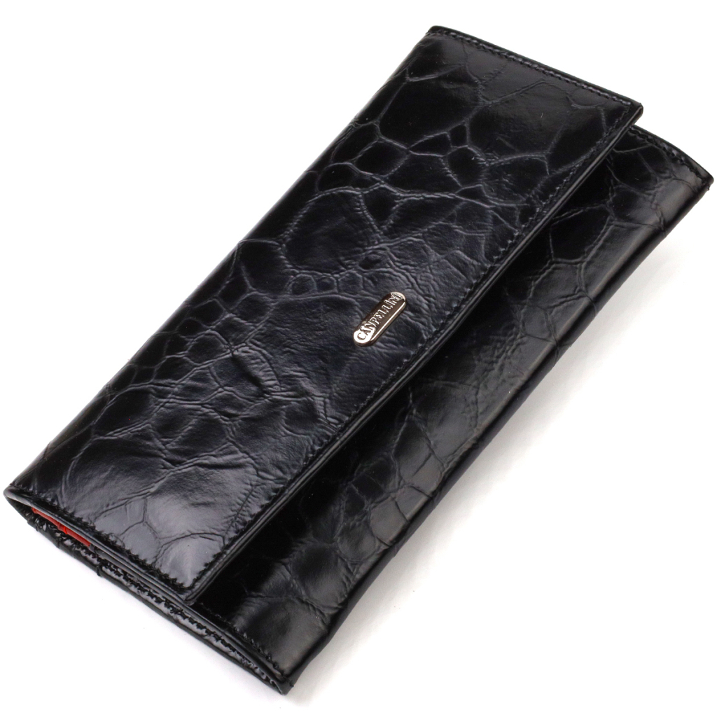 Фактурний жіночий гаманець горизонтального типу із натуральної шкіри. Аксесуар має одне основне відділення, шість кишень для карток (одна з них під сіточкою), приховану кишеню, три прилеглі кишені та зовнішню монетницю на блискавці. Закривається клапаном на кнопку