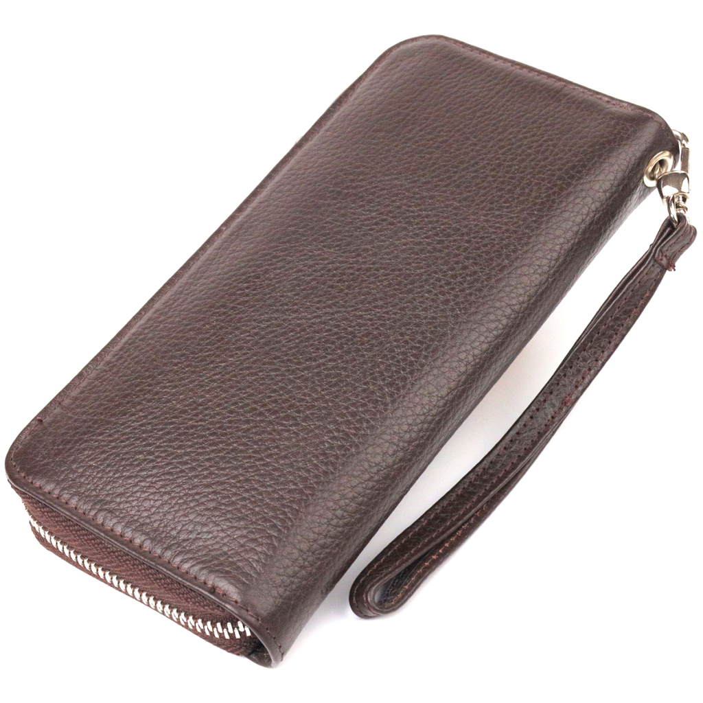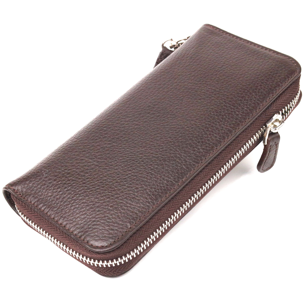 Місткий жіночий гаманець, з натуральної шкіри. Аксесуар має три основні відділення, в які поміщаються купюри всіх номіналів, дві перегородки, одна з них на блискавці, вісім кишень для карток, дві прилеглі кишені та знімний кистьовий ремінь. Закривається аксесуар на блискавку.
