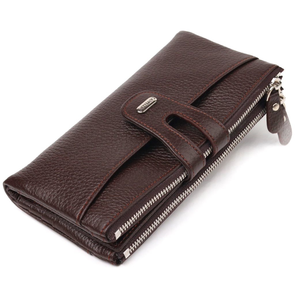 Місткий жіночий гаманець із натуральної зернистої шкіри. Аксесуар має два широкі основні відділення, у які поміщаються купюри всіх номіналів, дві монетниці, двадцять чотири кишені для карток, дві відкриті кишені зовні та одне прозоре віконце для документів. Закривається аксесуар хлястиком на кнопку.