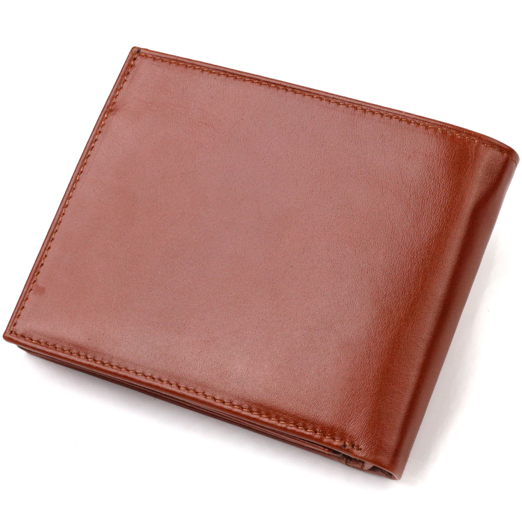 Стильний чоловічий гаманець із натуральної гладкої шкіри. Аксесуар має основне відділення для купюр, сім осередків для кредиток, три кишені під сіточкою для перепусток, дві приховані кишені, кишеню на блискавці.