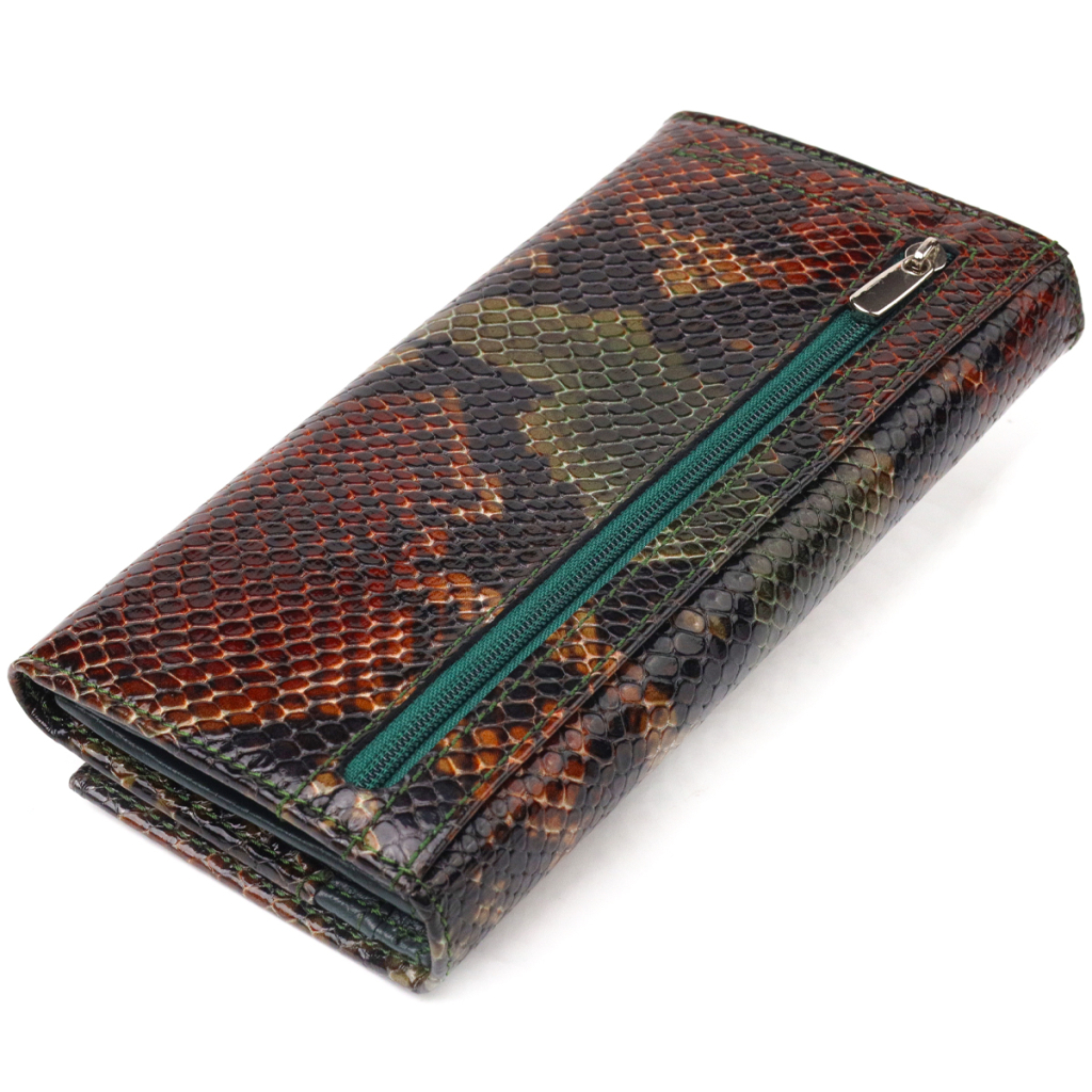 Жіночий яскравий гаманець з натуральної фактурної шкіри з тисненням під змію. Аксесуар має три широкі відділення для купюр з двома перегородками, одна з яких на блискавці, містку зовнішню монетницю, три приховані кишені та шість кишень для карток.