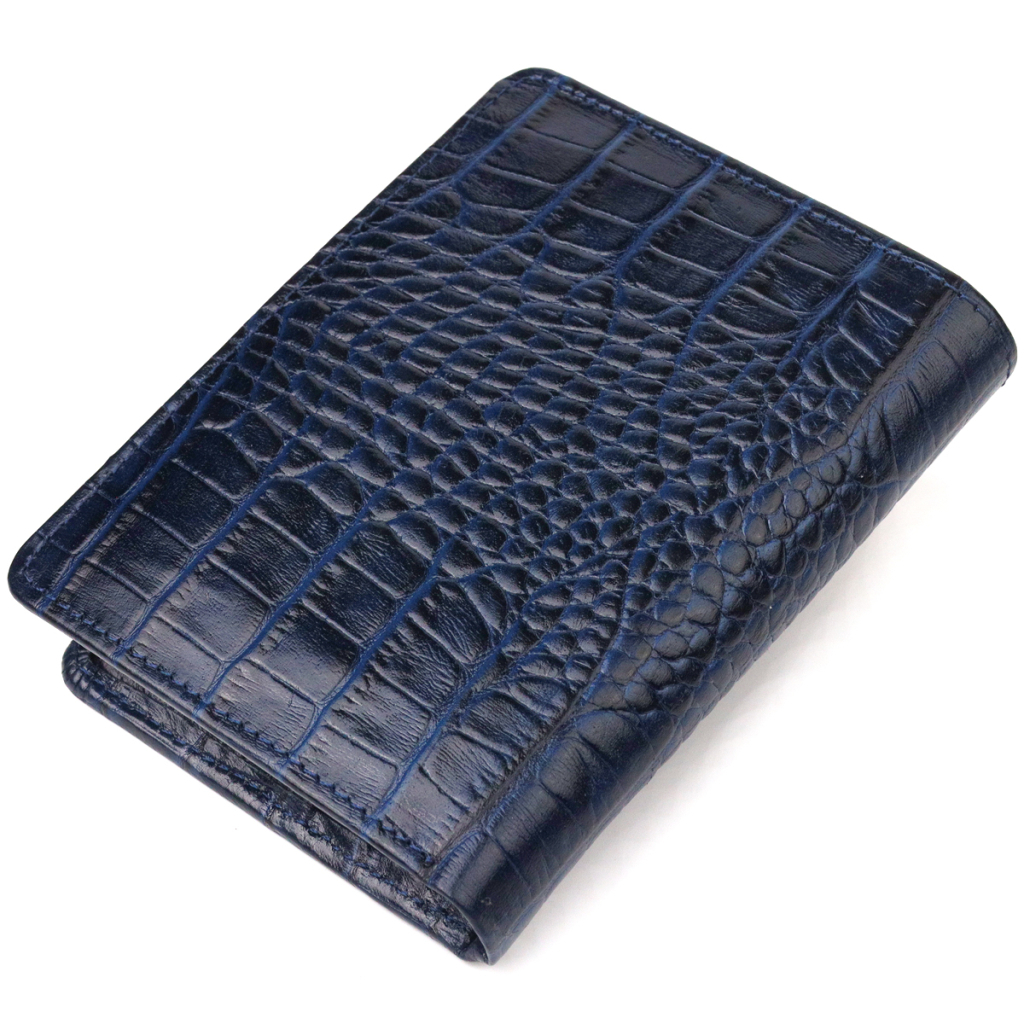 Жіночий модний гаманець компактного розміру з натуральної шкіри з тисненням під крокодила. Аксесуар має відділення для купюр з перегородкою, монетницю, що закривається клапаном на кнопку, приховану кишеню та сім відсіків для карток, два з яких під сіточкою.