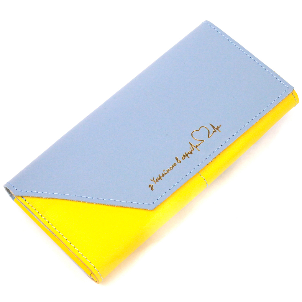 Місткий шкіряний гаманець, у комбінації двох кольорів жовтого та блакитного з патріотичним написом “З Україною в сердці”. Виріб пошитий із якісної шкіри, з високими показниками зносостійкості. Портмоне має три великі відділення для купюр усіх номіналів, а також вісім відділень для карт, монетницю на блискавці та закривається клапаном на магніти.