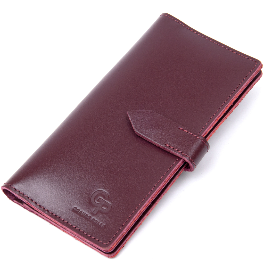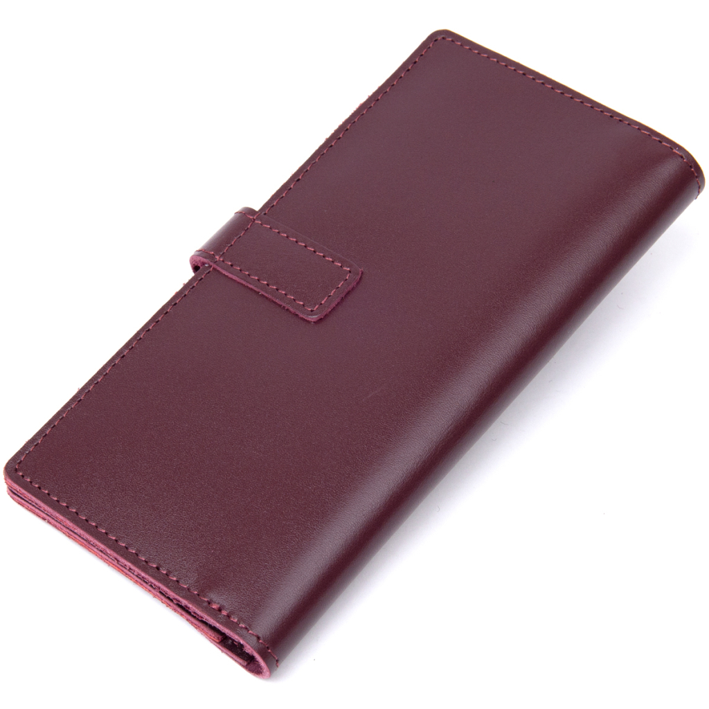 Красиве і багатофункціональне портмоне з висококласної натуральної шкіри. Закривається на хлястик з металевою кнопкою. Наповнення представлено у вигляді практичних відділень для купюр, монет і слотів для кредитних і візитних карток.