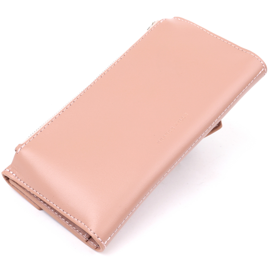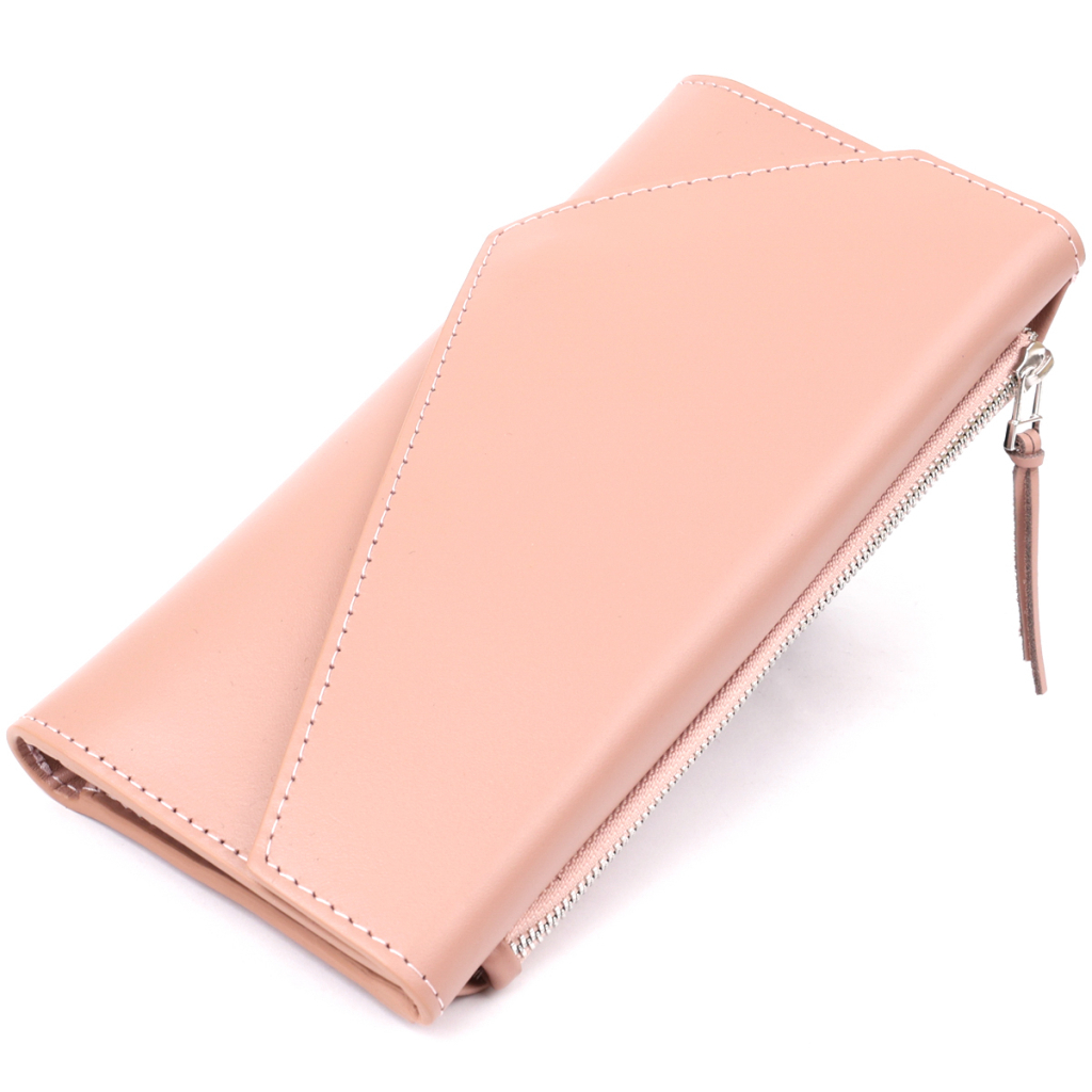 Практичний жіночий гаманець, який за своєю функціональністю дуже нагадує клатч. Має місткі відділення для купюр, монет, пластикових карток та ін. Матеріал виготовлення - натуральна зносостійка шкіра. Колір виробу - ніжно-рожевий, який виглядає дуже красиво і жіночно.