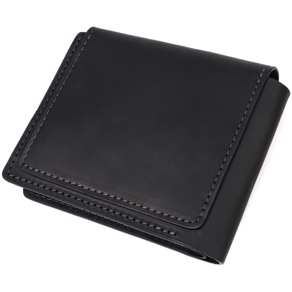 Невелике горизонтальне портмоне, виготовлене тільки з натуральної шкіри найвищої якості, без тканинної підкладки. Виріб виконаний у вінтажній шкірі, яка має підвищену міцність завдяки оригінальній фінішній обробці "крейзі хорс". Фішкою цього гаманця є трикутний клапан зверху, на який закривається аксесуар.
