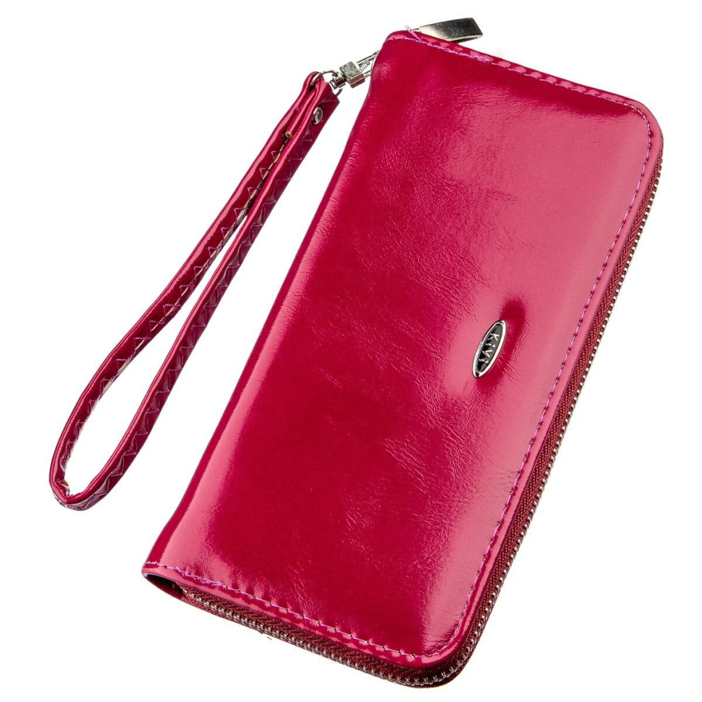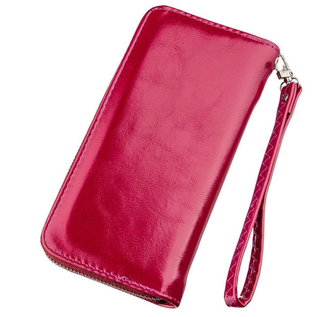 Витончений жіночий гаманець з екошкіри малинового кольору. Аксесуар має весь найнеобхідніший функціонал: просторі відділення для купюр, відділення для карток підібрані під розмір, відділення на блискавці і відкриті кишені.