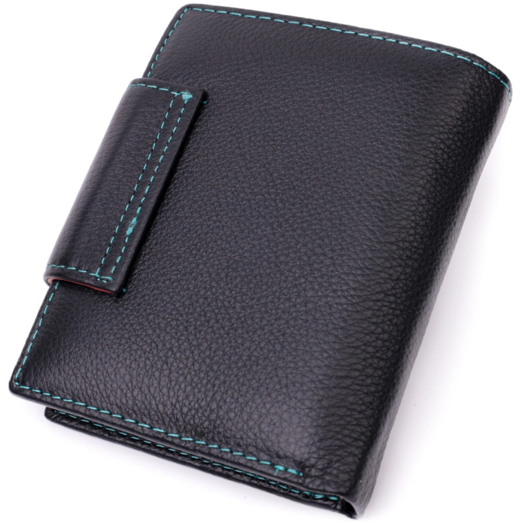 Портмоне доповнено надійною фурнітурою і бірюзовим декоративним рядком по краю.