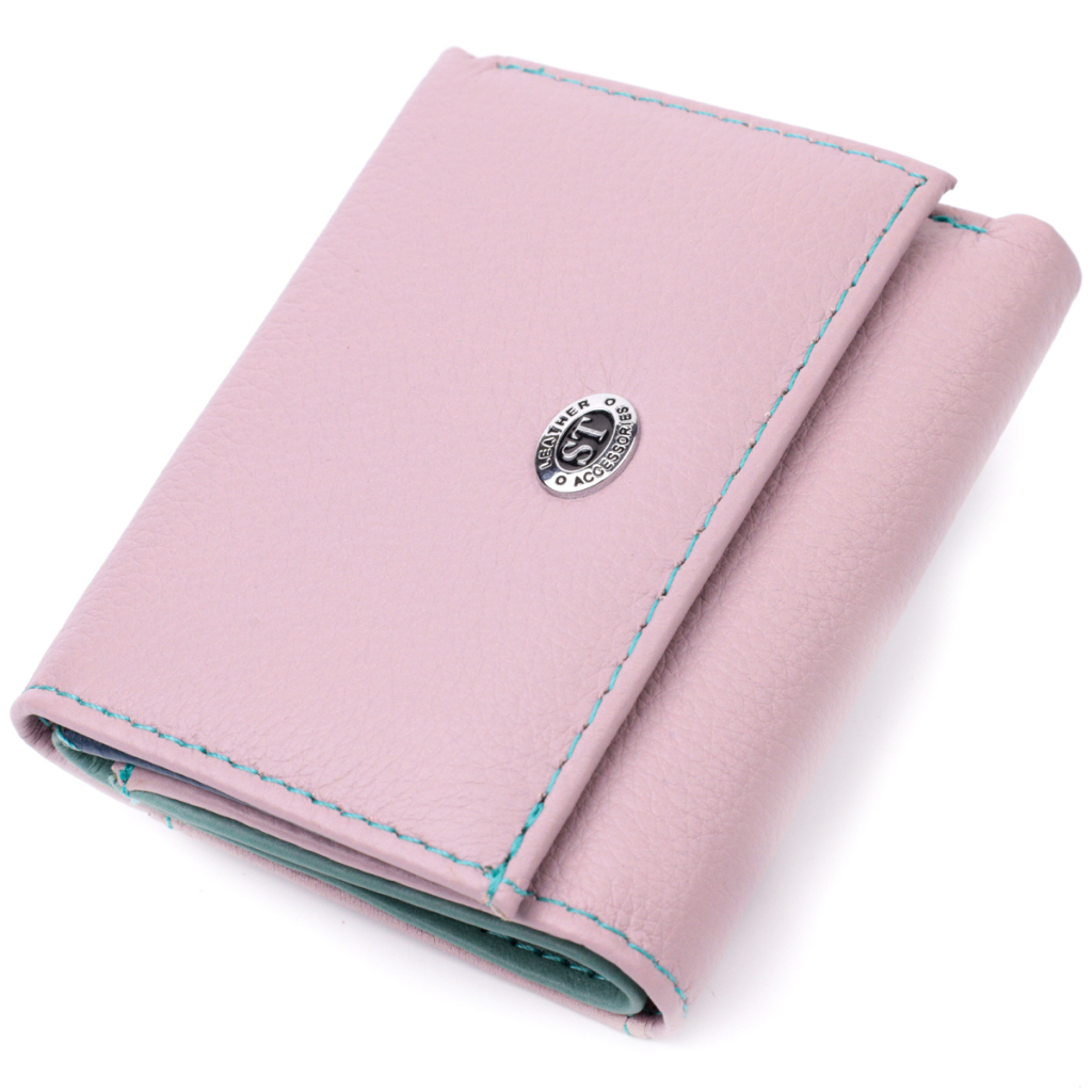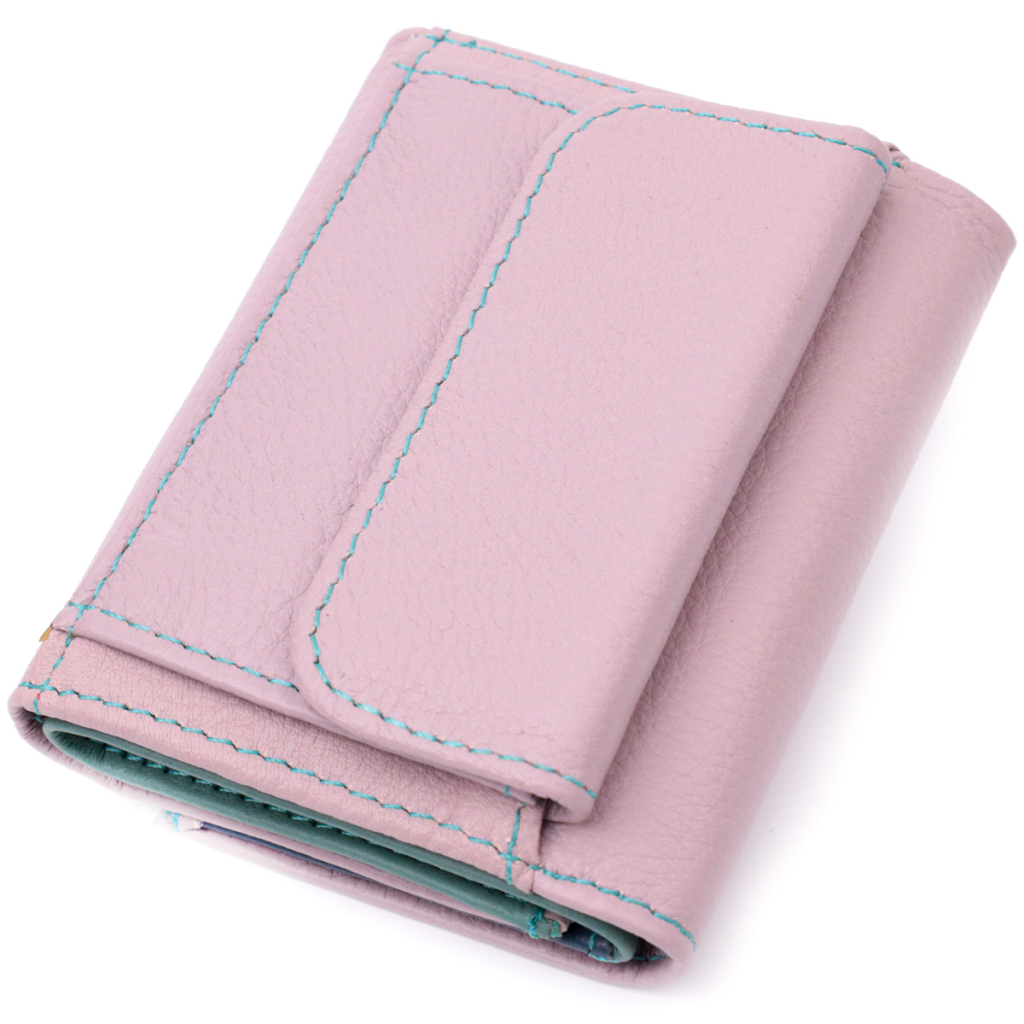 Ніжне жіноче портмоне в три складення з натуральної шкіри найвищої якості. Акцентом цього гаманця є колір, точніше кілька кольорів – він бежево-рожевого кольору зовні та багатобарвний усередині. Аксесуар складається з двох містких відділень для купюр, двох осередків для карток та кишені для монет. Зовні виріб прошитий рівним рядком бірюзового кольору по краю і прикрашений металевим логотипом компанії виробника. Портмоне доповнено надійною фурнітурою та міцною підкладкою.