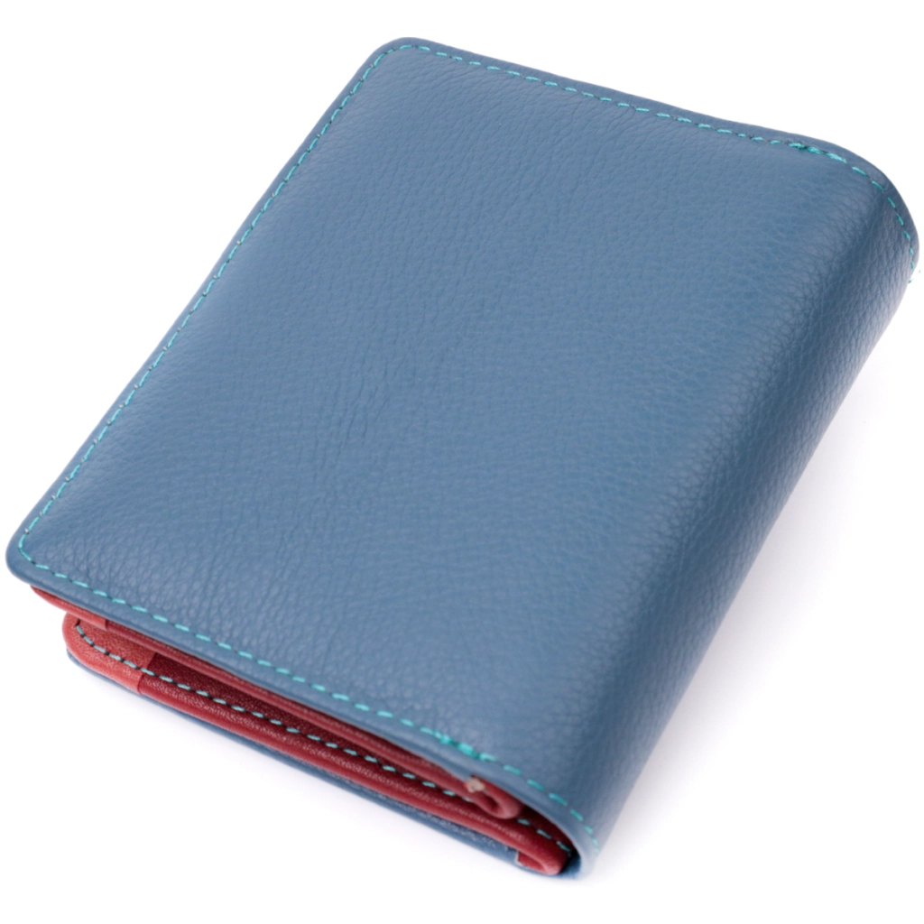 Портмоне доповнено надійною фурнітурою і акуратно прошито по краю рядком бірюзового кольору.