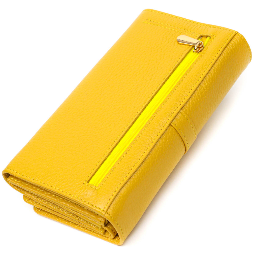 Яскравий жіночий гаманець із натуральної шкіри флотар, для якої характерна міцність, зносостійкість та зерниста фактура. Аксесуар складається з чотирьох широких відділень для купюр, одинадцяти осередків для пластикових карток, двох прилеглих кишень та трьох кишень на блискавках, які можна використовувати як монетниці. У виробі використано якісну фурнітуру золотистого кольору. Закривається гаманець клапаном на кнопку.