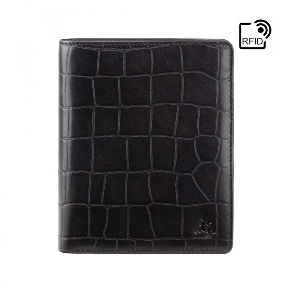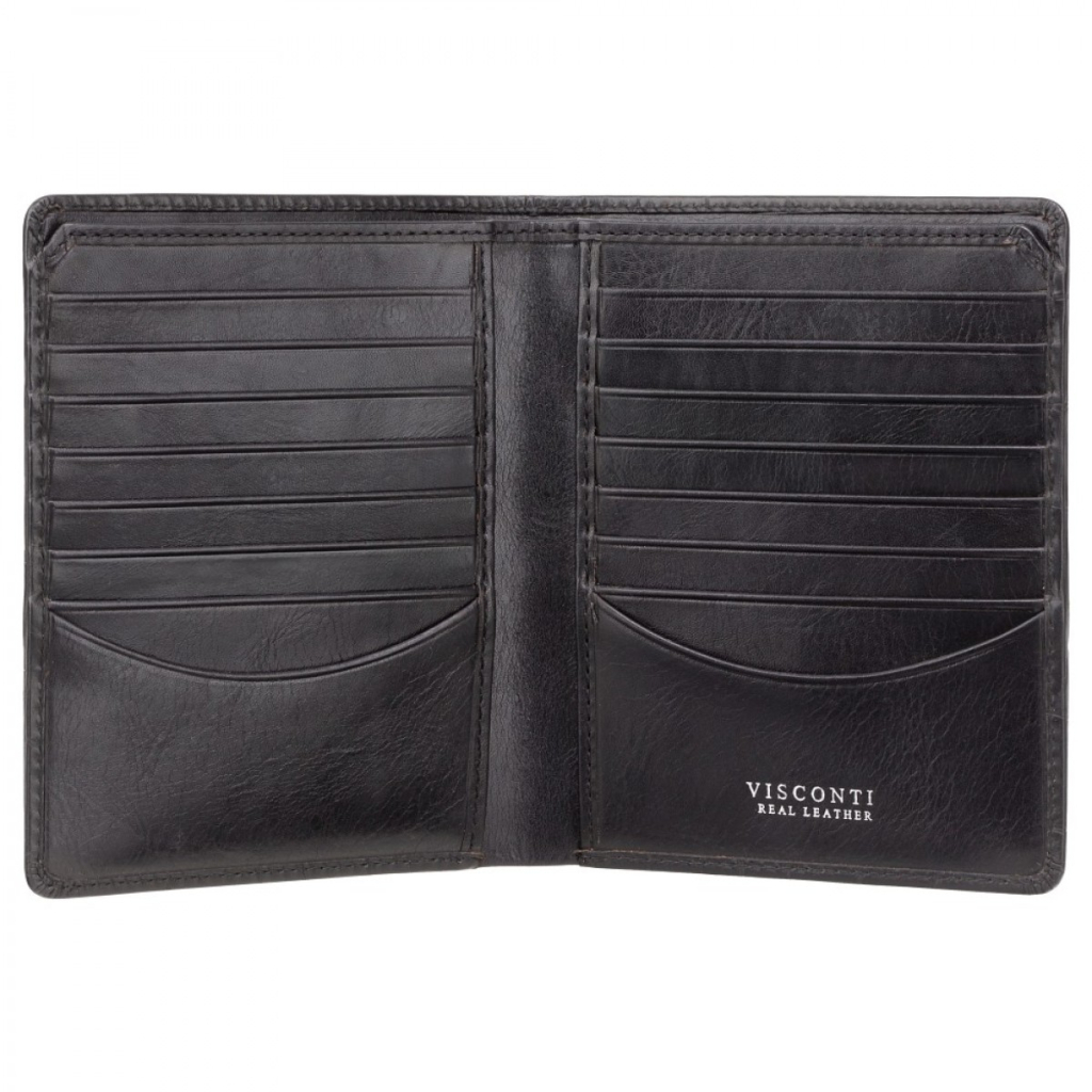 Багатофункціональний чоловічий гаманець із дуже міцної телячої шкіри рослинного дублення з тисненням під крокодила. Чудовий вибір подарунка для солідного чоловіка. Модель має вбудований RFID – чіп для ваших банківських карток та документів від несанкціонованого доступу. Зовні має видавлений у шкірі фірмовий логотип Visconti. Модель випускається у трьох кольорах.