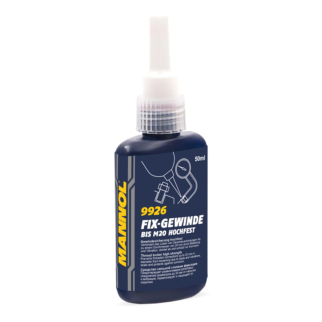 Mannol Fix-Gewinde hochfest запобігає розхитуванню й міцно фіксує металеві гвинтові з'єднання з кроком різі до М20. Витримує сильні вібрації. Фіксується за 10-20 хвилин, повністю застигає за 1-3 години. Цей продукт витримує крутний момент за M10 до 38 Nm.